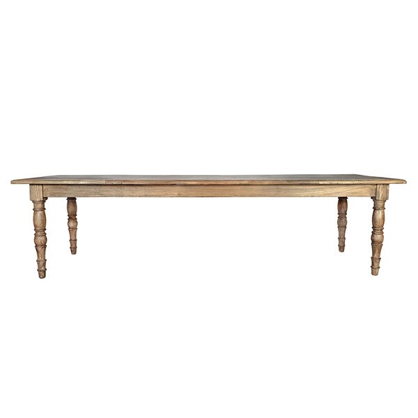 MADE FROM SOLID RECLAIMED ELM, THIS DINING TABLE FEATURES A DURABLE TABLE SURFACE WITH A RUSTIC LOOK THAT REALLY SHOWS OFF THE BEAUTIFUL WOOD GRAIN. CLASSICALLY SUPPORTED UP ON 4 ELEGANTLY CARVED LEGS, THIS SOLID TABLE IS PERFECT FOR UP TO 8 DINERS, SURE TO IMPRESS.