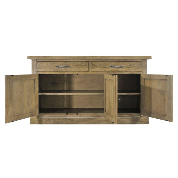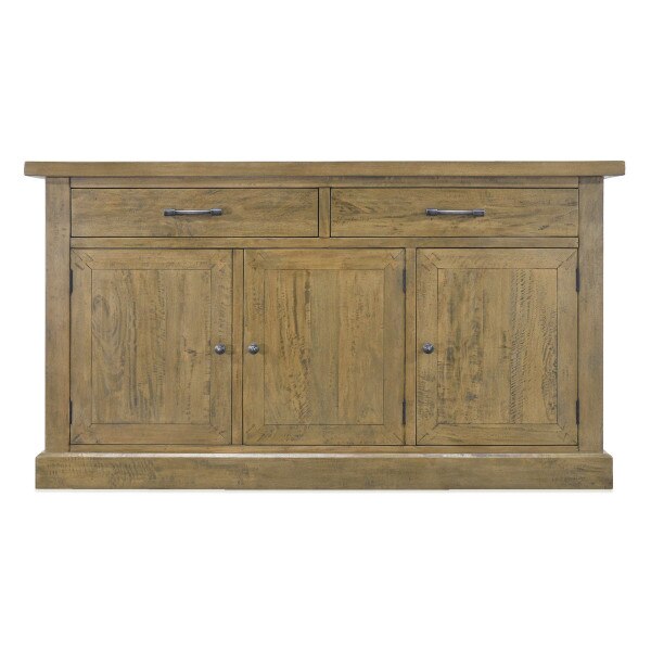 THIS BEAUTIFUL BOSQUET 3 DOOR/2 DRAWER BUFFET IS A GREAT OPTION TO ADD CHARACTER AND TEXTURE INTO YOUR HOME. COMING WITH A RUSTIC LIGHT FINISH, THIS CABINET SHOWS OFF THE WONDERFUL GRAIN AND WARMNESS OF THE WOOD, COMPLIMENTED BY METAL HANDLES.
