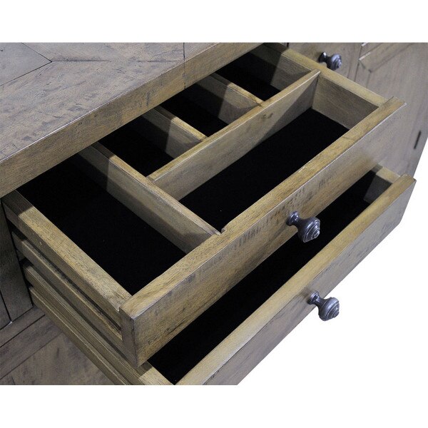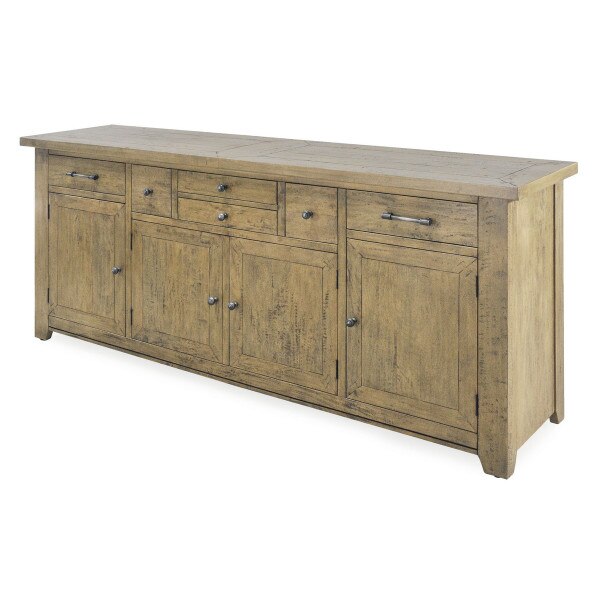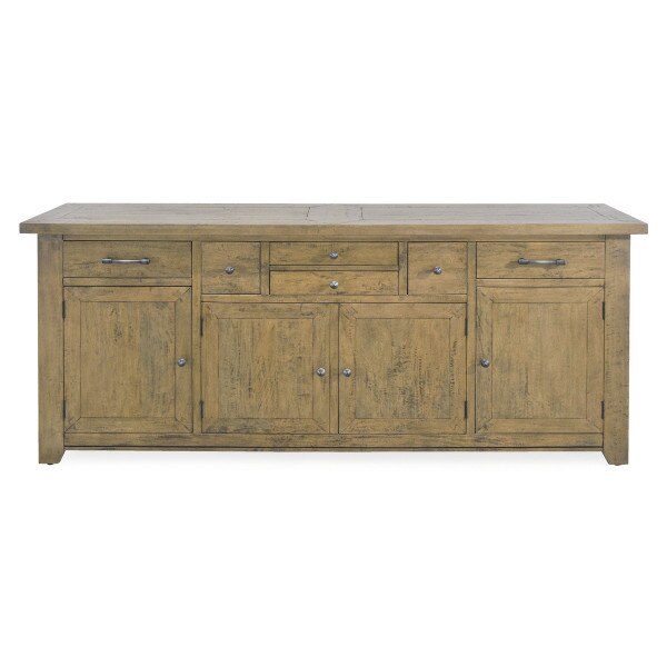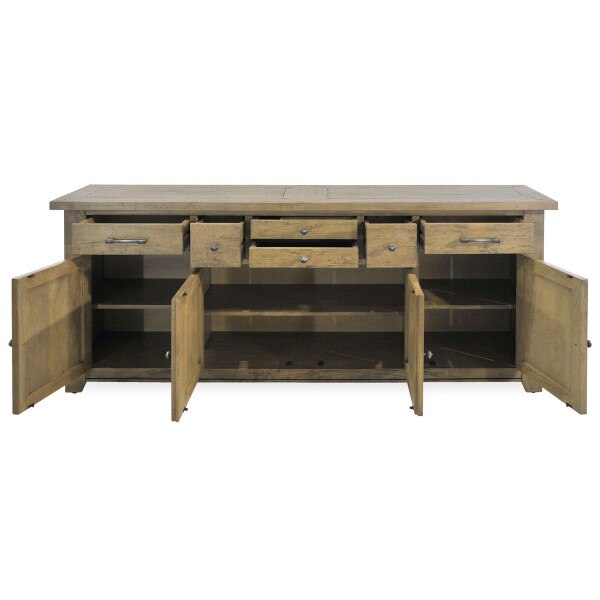 WITH HEFT AND CHARACTER, THIS BOSQUET 4 DOOR & 6 DRAWER BUFFET IS WONDERFULLY RUSTIC IN CHARACTER. MADE FROM QUALITY MANGO WOOD WITH METAL HANDLES, THIS BOLD PIECE REALLY SHOWS OFF THE WOODS NATURAL OPEN GRAIN AND BEAUTIFULLY UNIQUE KNOTS. IT WOULD LOOK FANTASTIC IN MOST LIVING AREAS.