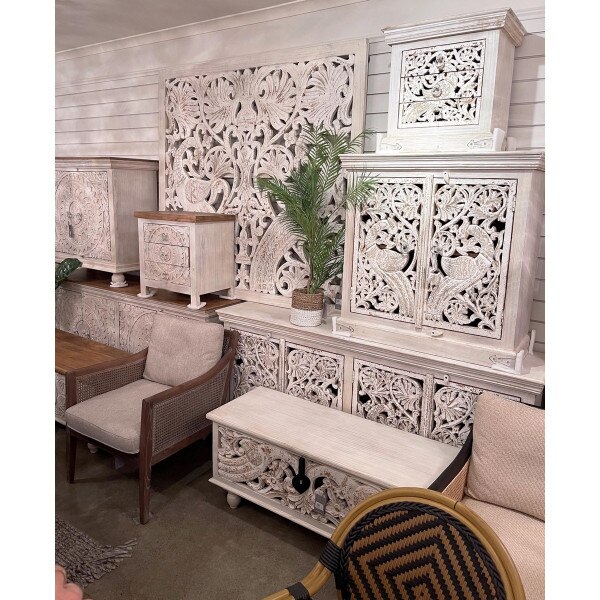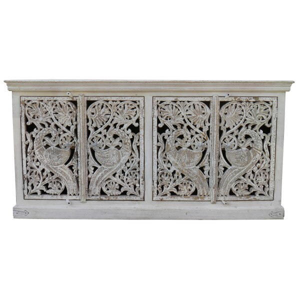 THIS BEAUTIFUL HAND CARVED TEAK 4 DOOR BOHO CONSOLE WITH ITS ELEGANT DETAILING AND PAINTED IN A DISTRESSED WHITE ADDS A VINTAGE BOHO FEEL. A TRUE VISUAL PIECE, THIS WILL STAND OUT IN ANY LIVING AREA AND COMPLIMENT RUSTIC OR VINTAGE INSPIRED SPACES.