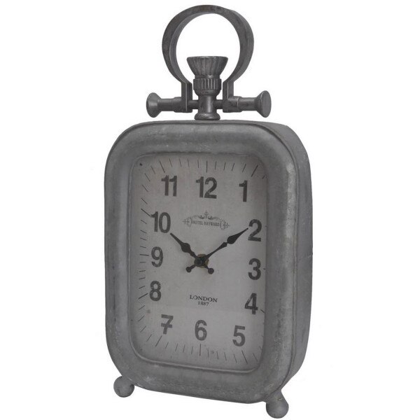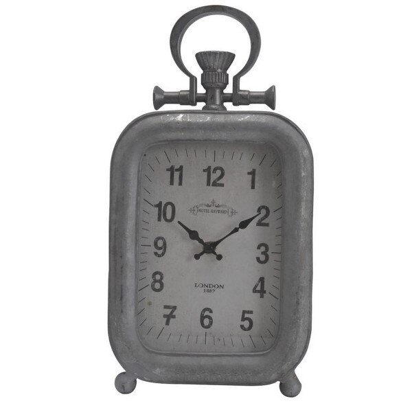 USE THIS VINTAGE DESK CLOCK TO KEEP TRACK OF TIME AND ADD RUSTIC CHARM TO YOUR HOME. MADE FROM IRON, GLASS, AND MDF, THIS RECTANGULAR DESK CLOCK FINISHED IN AN ANTIQUE SILVER DESIGN. SOUTHERN CHARM MIXES WITH TIMELESS DESIGN IN THIS DESK CLOCK.